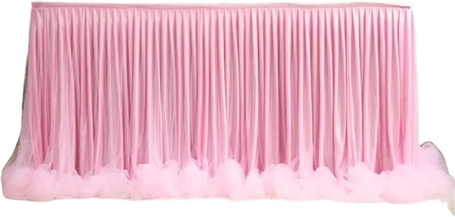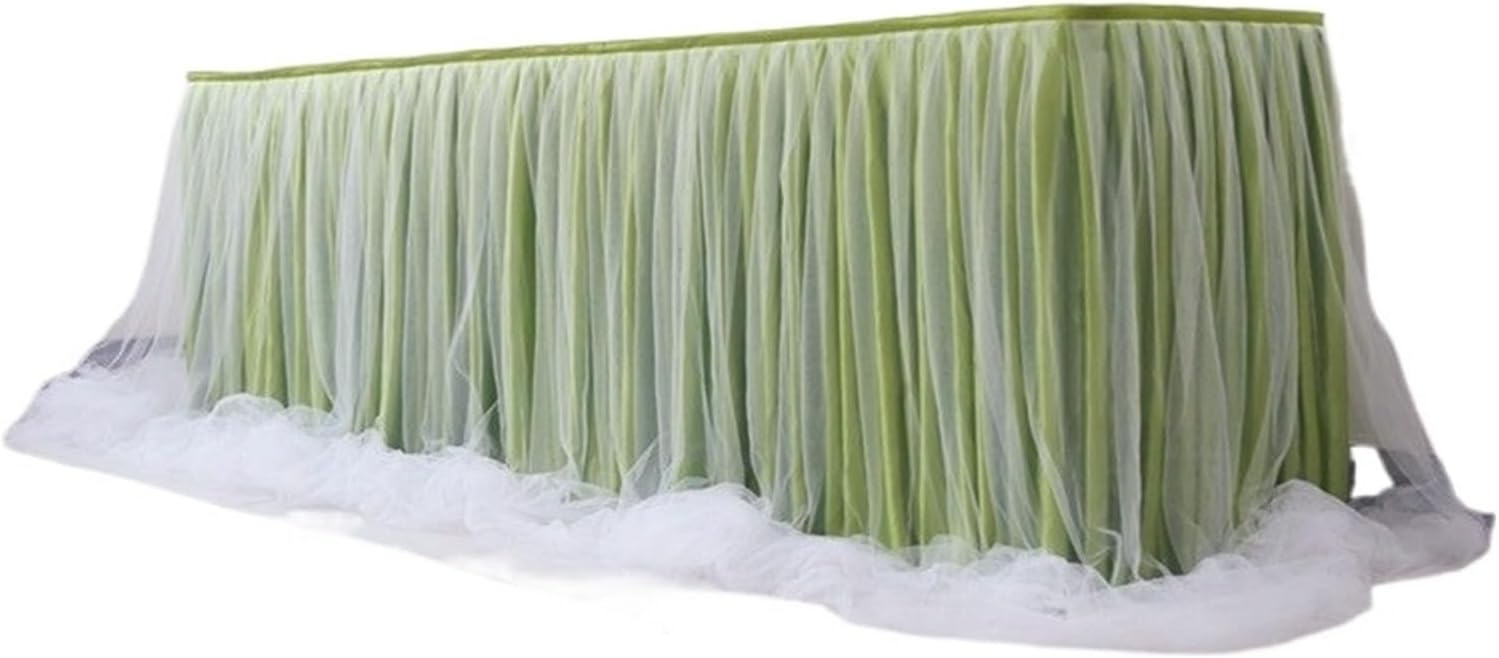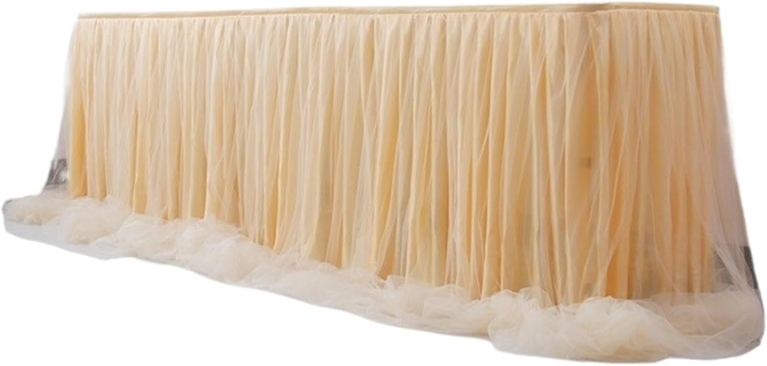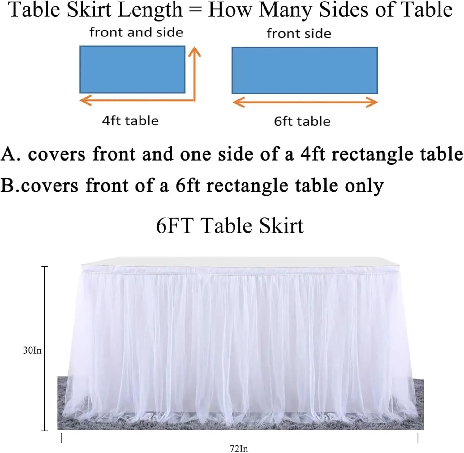 Table skirt size:9FT Tulle table skirt refers to the length of the table skirt, not the table. 9ft (L108in×H30in) table skirt: 1.can covers front and two sides of a 4ft rectangle table 2.covers front and one side of a 6ft rectangle table 3.only covers front of an 8ft rectangle table.Fluffy table skirt easy install:Tutu table skirt sewn with loop under the top edge, and the package include hook with back adhesive. Stick the hook on the table and put the table skirt top edge right on the hook, the hook and loop stick together, done!Tutu table skirt material: High end anti-wrinkle high count nylon makes it feel more soft, easy to handle, comes with anti-wrinkle lining, great looks.White cloth table skirt highlight: Gold brim,High end, Hook on table skirt, easy installEasy install & reusable:Our table skirt comes with plenty of adhesive hookandloop fastener strips that are very strong and hold up nicely. Put the hook side on the edge of the table and loop side on the table skirt, then stick the hook and loop together, done!Applicable occasion:Our tulle table skirt skirting is perfect for party such as ,bride shower,wedding party,1st birthday party,holiday parties,family gathering.The price is for the table skirt cloth, included 1pc skirt(Size:9FT long)+ 9pcs clips(the clips can fit the thickness of the table within 2.5cm).